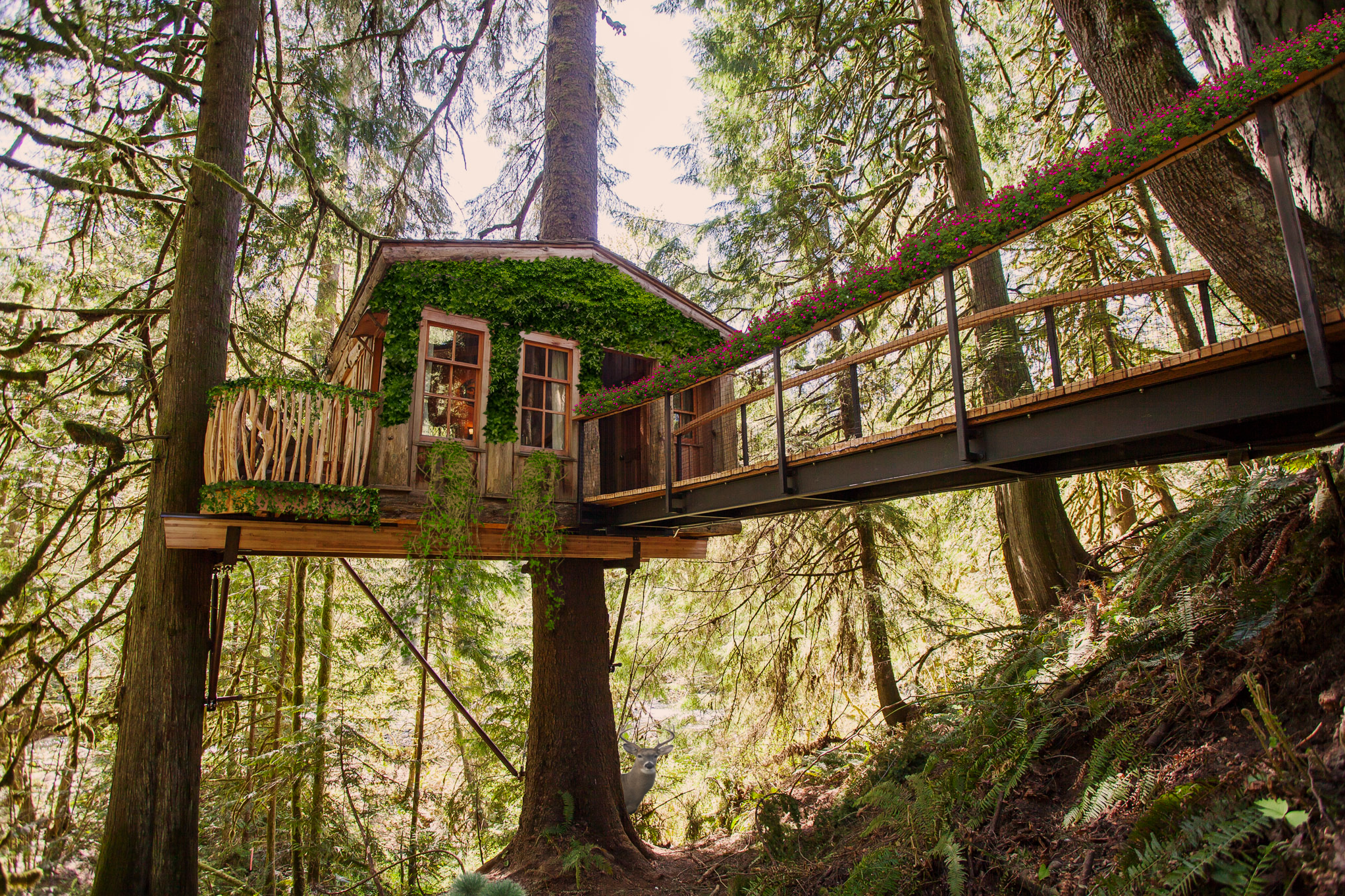 Image of log cabin overflowing with nature.
