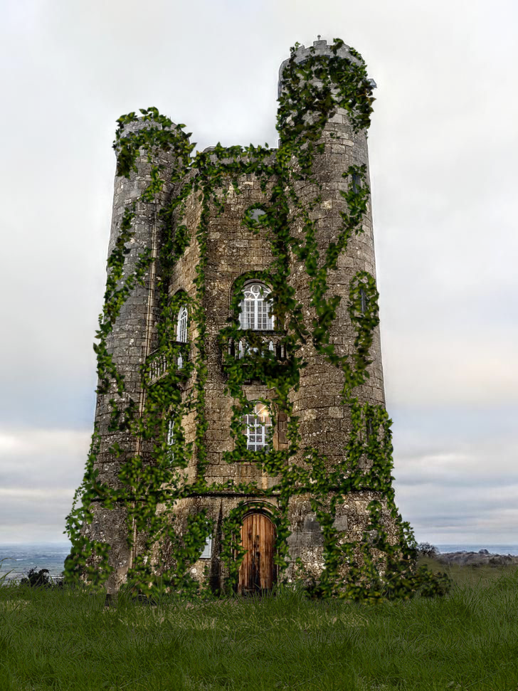 Image of old castle tower being consumed by vines.